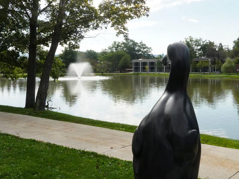 The great auk, which was a large flightless seabird found in the North Atlantic Ocean, can be found at the Penn State Altoona Reflecting Pond. Credit: Jack Meyer. All Rights Reserved.