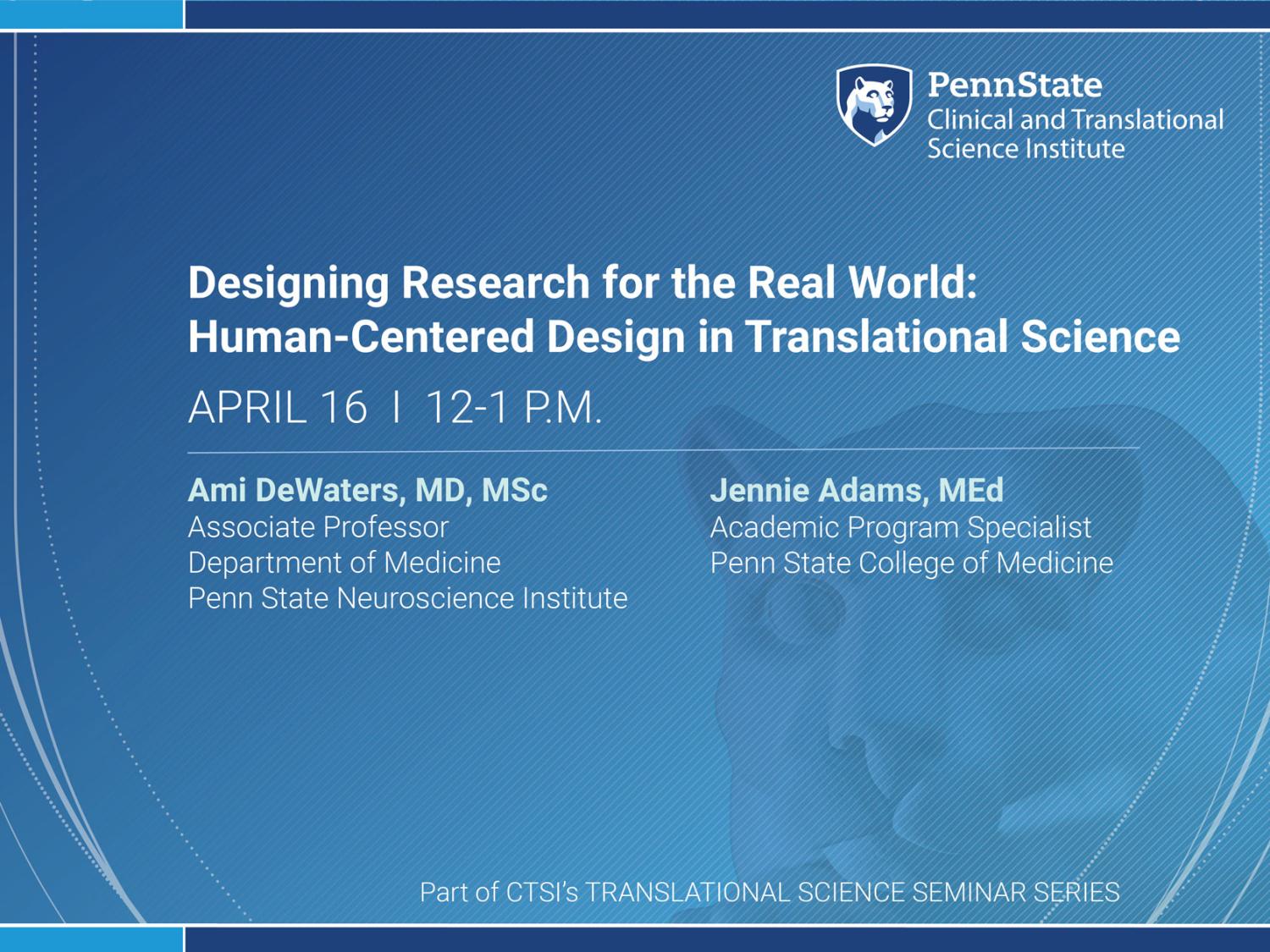 Penn State CTSI TSS Webinar: 'Designing Research for the Real World: Human-Centered Design in Translational Science' presented by Ami DeWaters, MD, MSc, and Jennie Adams, MEd Credit: Penn State. Creative Commons