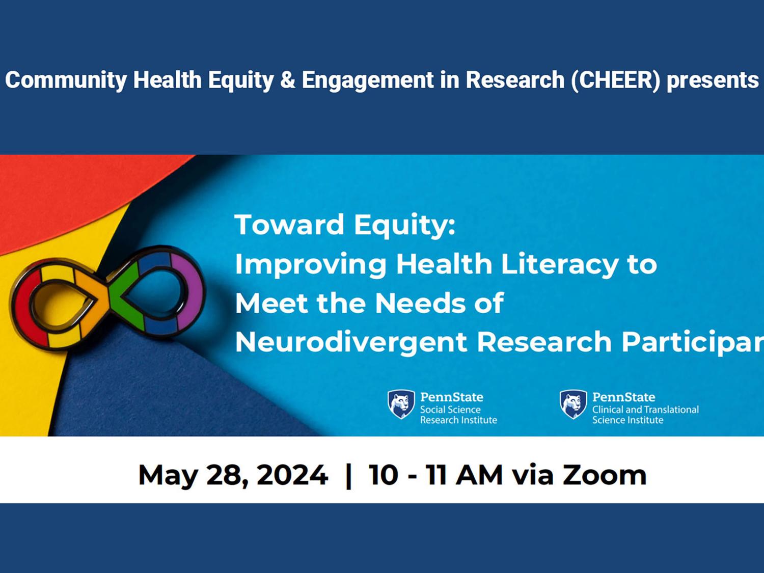 The Penn State Community Health Equity & Engagement in Research (CHEER) team will host a session to provide guidance to research teams around the unique needs and interests of individuals who identify as neurodivergent.
