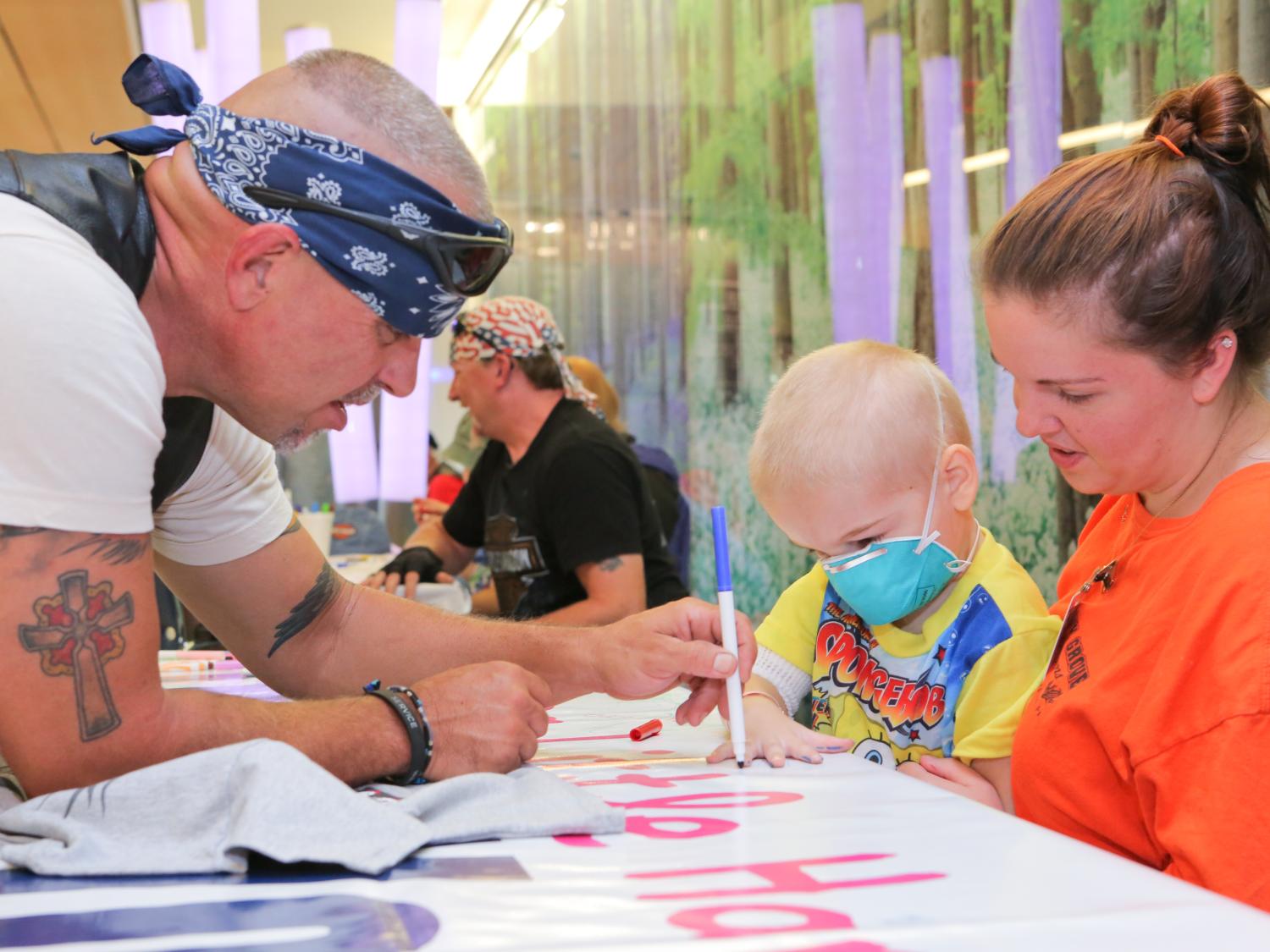 Patient Lee Ocker of Dillsburg has his hand traced onto a banner brought by the bikers to the Children's Hospital. Credit: Penn State. Creative Commons