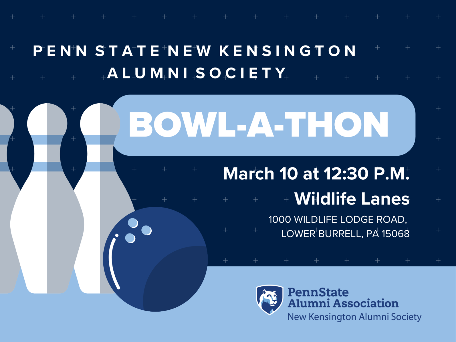 The Penn State New Kensington Alumni Society Bowl-A-Thon is scheduled for March 10 at 12:30 p.m. The annual event will be held at Wildlife Lanes in Lower Burrell. Bowler and sponsorship opportunities are available. For more details, contact the Office of Development and Alumni Relations at 724-334-6056 or tms57@psu.edu. Credit: Penn State New Kensington Office of Development and Alumni Relations. All Rights Reserved.